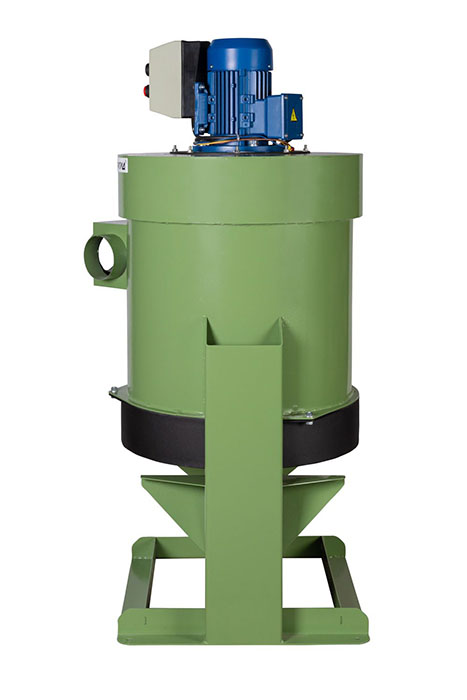 Крупные сырьевые частицы выпадают из потока под действием собственного веса, осыпаясь в бункер, пыль с воздушным потоком проходит через фильтрующий элемент, где задерживается. Очищенный воздух поступает в центральную часть улитки где вращающееся рабочее колесо, приводимое в действие электродвигателем, ускоряя поток и выводит его наружу;