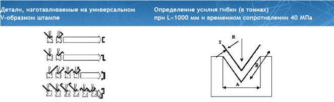 - В универсальном V-образном штампе, поставляемом в комплекте с прессом, можно производить гибку большого числа различных деталей. В специальных штампах, поставляемых за отдельную плату, может быть выполнена гибка сложных деталей за один переход, гибка по радиусу, штамповка и резка заготовок листа;