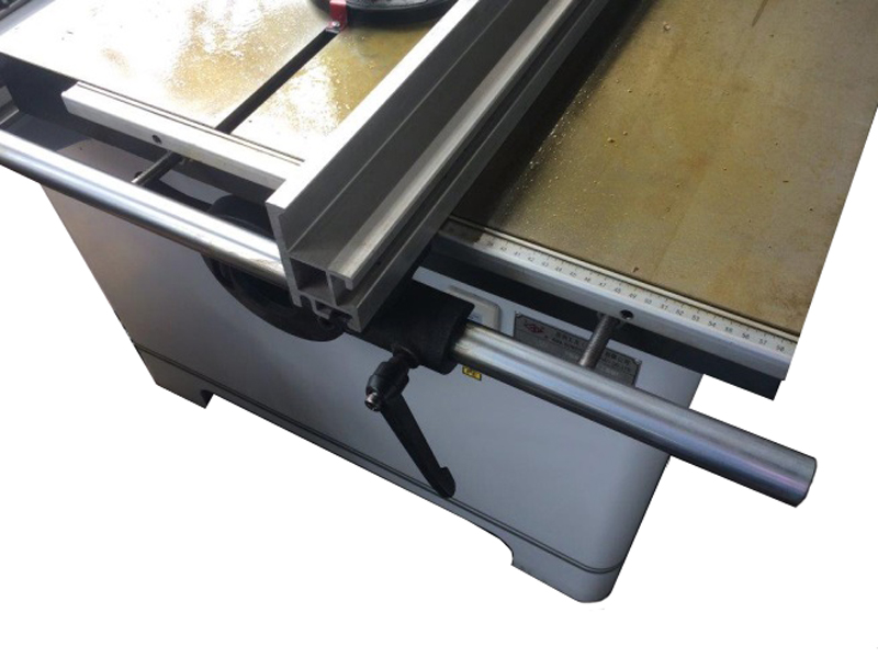 - Для раскроя по ширине используется параллельный упор с миллиметровой шкалой, перемещение упора по массивной цилиндрической направляющей, для стабильности выставленного размера снабжен фиксирующим винтом;