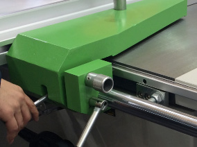 Удобство настройки подрезного узла Ручки точной настройки подрезного узла по высоте и соосности вынесены на заднюю стенку станка. Такая система позволяет быстро и удобно откалибровать подрезную пилу не откатывая при этом каретку в крайнее положение. На задней стенке станка также расположен маховик настройки пильного узла по высоте. |