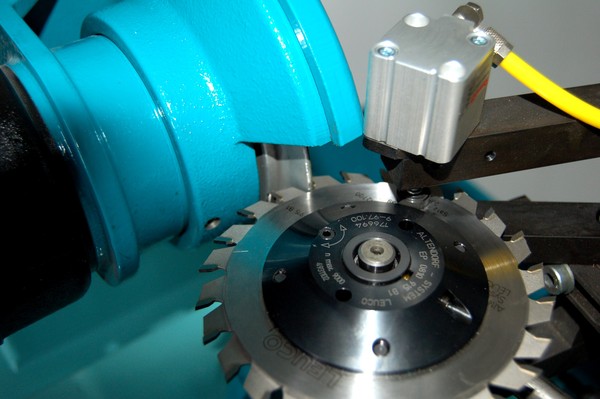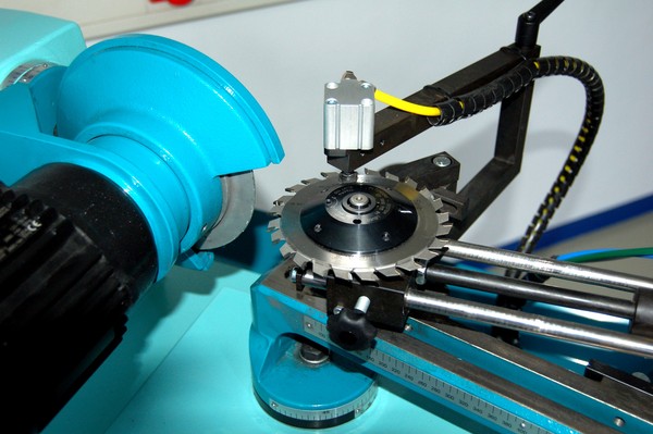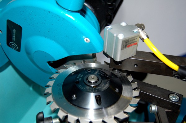- Подача пильного диска на заточной круг происходит прямолинейно, благодаря чему исключаются какие-либо отклонения в геометрии затачиваемого зуба. Фиксация пилы во время заточки осуществляется отдельным пневмоцилиндром, давление в котором регулируется;