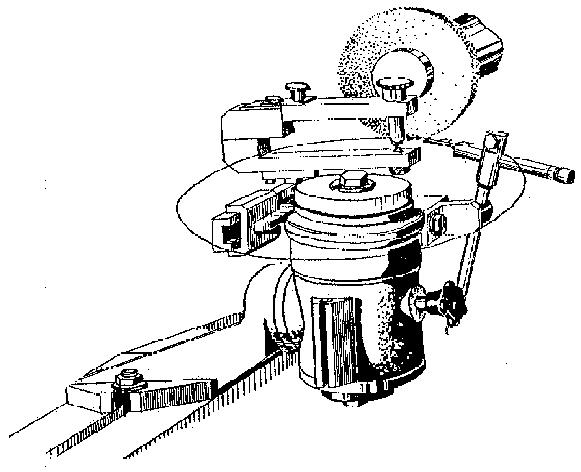 Принцип работы: Установить пилу. Выставить затачиваемую поверхность зуба параллельно продольному перемещению стола поворотом универсальной бабки вокруг горизонтальной оси. Установить ось шпинделя шлифовальной головки так, чтобы она проходила через переднюю поверхность затачиваемого зуба. Подвести упорку до касания с передней поверхностью затачиваемого зуба. Установить ось круга относительно затачиваемой поверхности так, чтобы получить заданный угол на торце зуба. Подача осуществляется вертикальным движением шлифовальной головки.