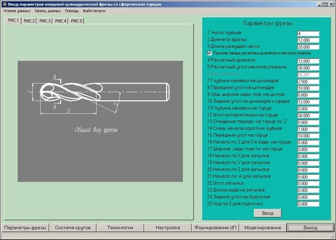 Система подготовки управляющих программ для изготовления и заточки режущего инструмента реализована на базе персонального компьютера, представляет собой WINDOWS-приложение и работает независимо от полуавтомата и имеет возможность свободного программирования. Программа имеет дружественный, интуитивно понятный интерфейс. Для составления управляющей программы не требуется глубоких знаний языка программирования УЧПУ, а также знаний теории режущего инструмента и винтовых поверхностей. Создание управляющей программы для обработки того или иного типа инструмента происходит автоматически.