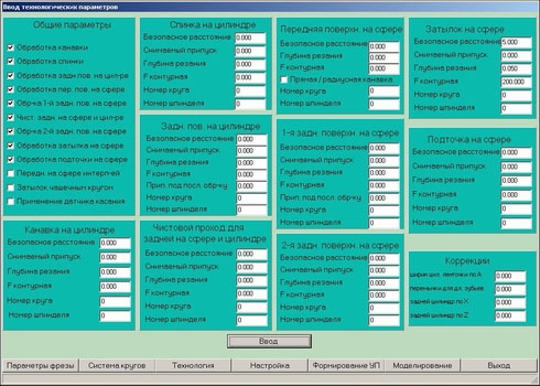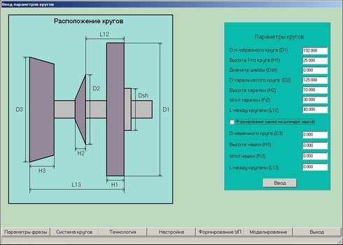 Кроме этого вводятся геометрические параметры набора шлифовальных кругов, которыми будет производиться обработка (скриншот 2) и технологические данные (скриншот 3).