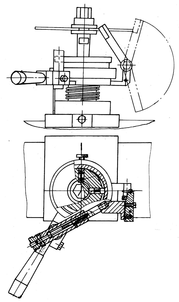 Принцип работы: Заточка осуществляется предварительно заправленным тарельчатым кругом. Установить фрезу на шпинделе приспособления. Установить по лимбу передний угол. Ввести шаблон во впадину первого затачиваемого зуба, затем вместо него ввести упорку. Повернуть фрезу упоркой на передней угол (задний угол) по соответствующему лимбу. Закрепить фрезу. Подвести фрезу до касания круга с затачиваемой поверхностью. Продольным перемещением стола произвести заточку.