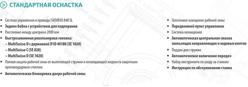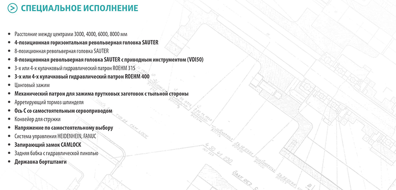 -широкий выбор дополнительной оснастки – гидравлический зажим, гидравлическое управление задней бабкой, привод вращающегося инструмента, закрывающая ось С, широкий диапазон длины обточки, большой выбор люнетов и зажимных плит.